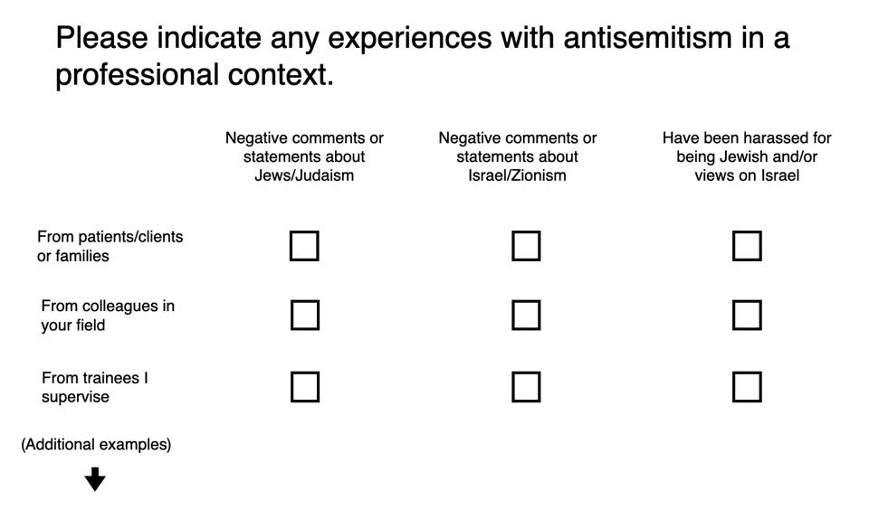 Respondents were asked to “Please indicate any experiences with antisemitism in a professional context” by checking a box if they’ve ever had that experience in eight different contexts (I’ve shown only the first three here). Three columns were provided: “Negative comments or statements about Jews/Judaism,” “Negative comments or statements about Israel/Zionism,” and “Have been harassed for being Jewish and/or views on Israel.” This framing and format are very problematic.