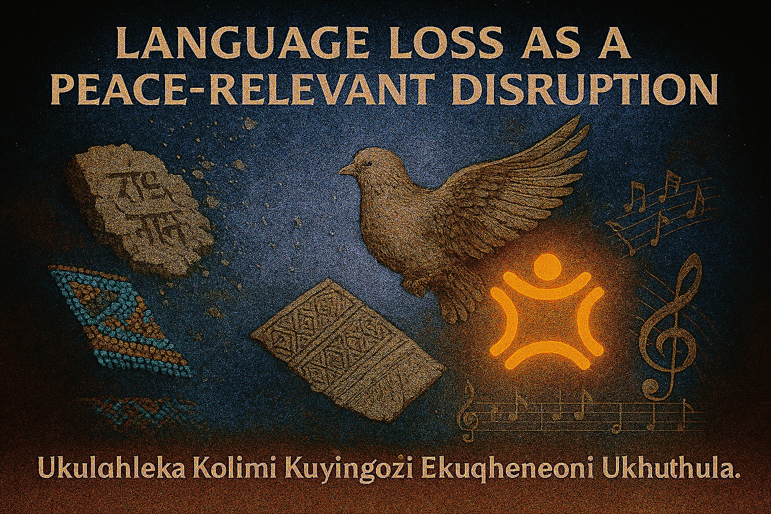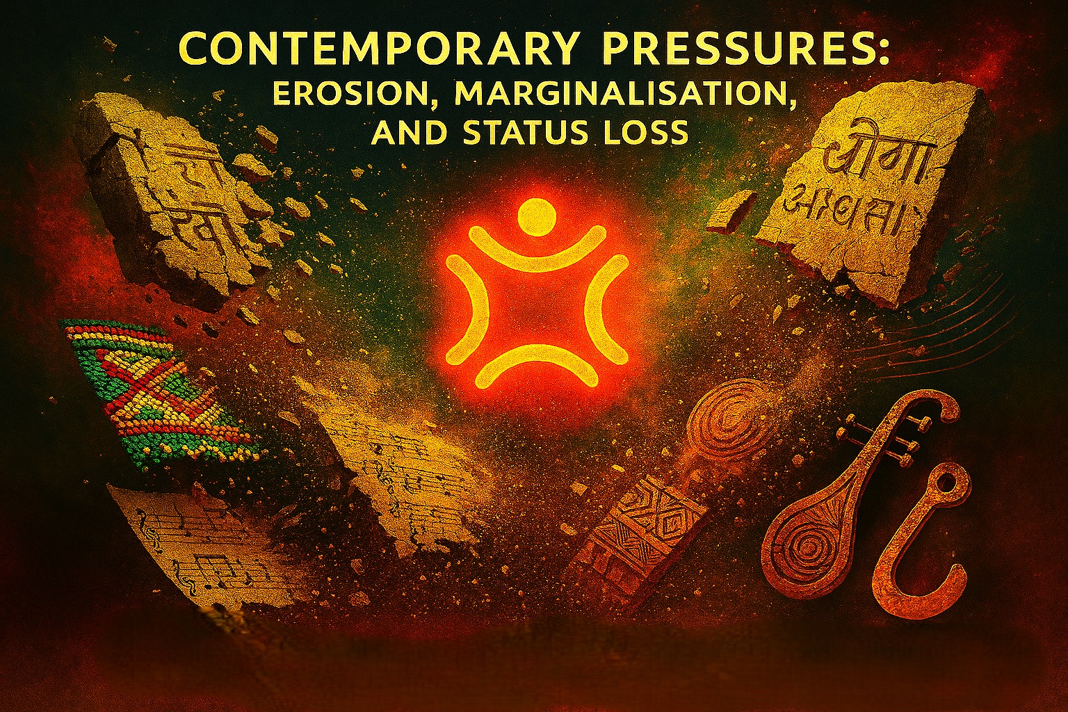 Contemporary societal pressures: erosion, marginalisation, and status loss, fracture the cultural foundations on which indigenous languages stand, threatening the continuity of collective memory and identity. The cosmic cultural‑collage concept is dramatic, symbolic, and holistically representing the forces that erode indigenous languages: Fragmenting stone tablets → loss of ancient scripts. Dissolving cultural motifs → fading traditions. Scattered musical notation → vanishing oral and musical heritage. Ubuntu core glowing at centre → the moral imperative to preserve. Veena silhouette → multilingual cultural synergy. Swirling dust and cosmic gradient → the vastness of history and the fragility of memory, with eventual Peace Disruption.