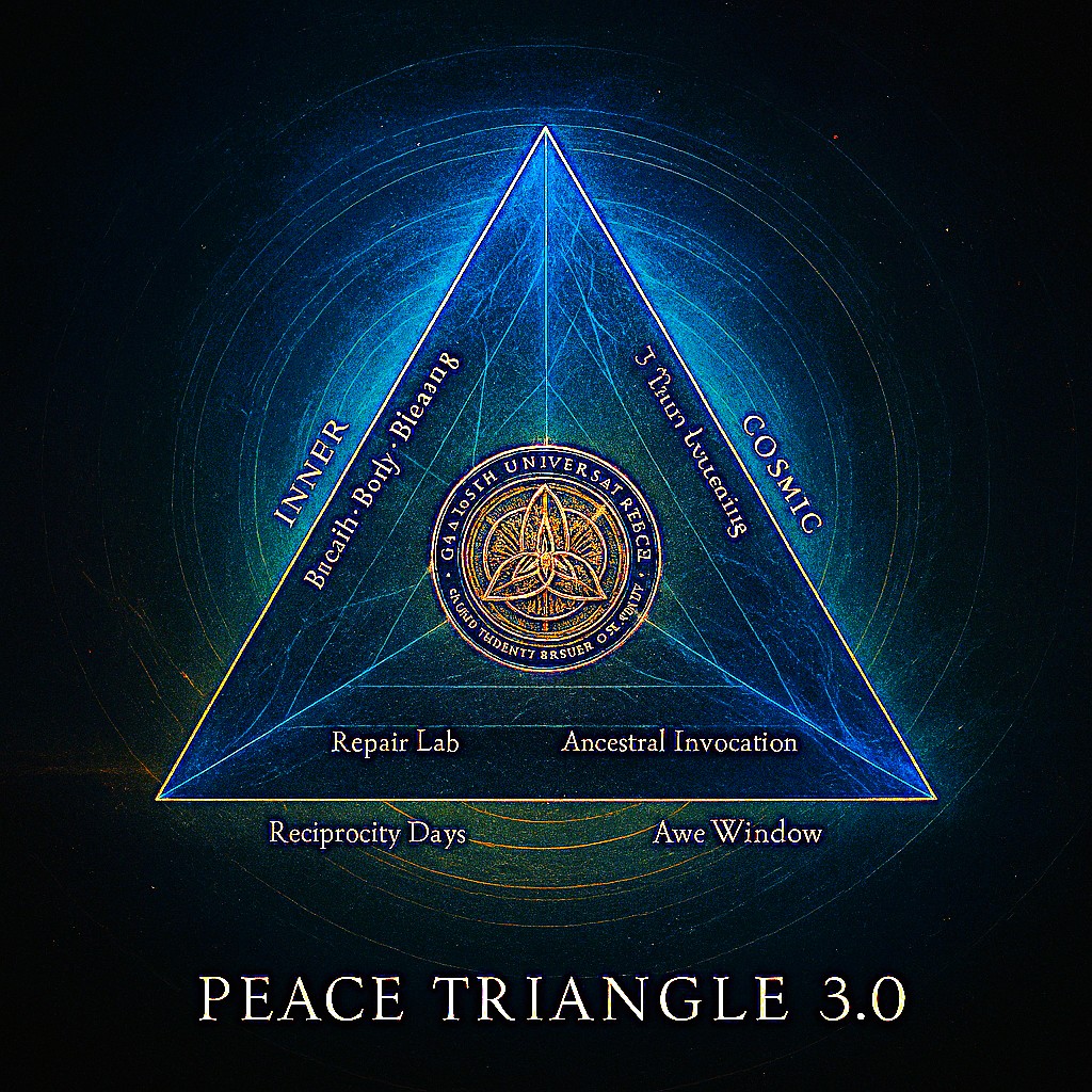 This Part 3, of the Trilogy does not promise the end of conflict. It promises the end of decoherent conflict, the end of cycles that feed on fear and forget relationship. Like the final act of an epic, we arrive where we began, but now we understand: the triangle was always a compass, the Trinity always a becoming. The seal reads: QUANTUM UNIVERSAL PEACE. The tagline answers: Where Humanity Becomes Coherence. The credits have not yet rolled. The work proceeds, hence the title of this publication: The Geometry of Peace: From Triangles to Trinity to Transcendence.