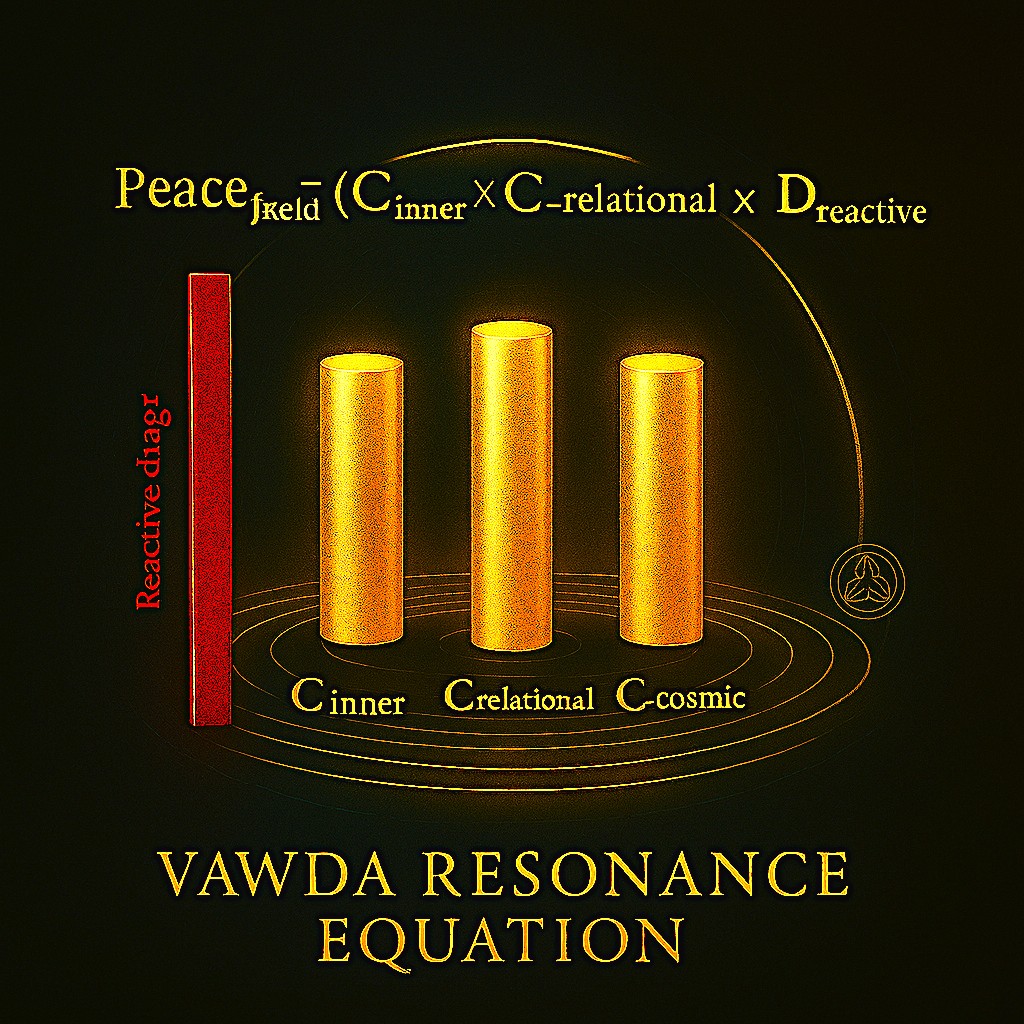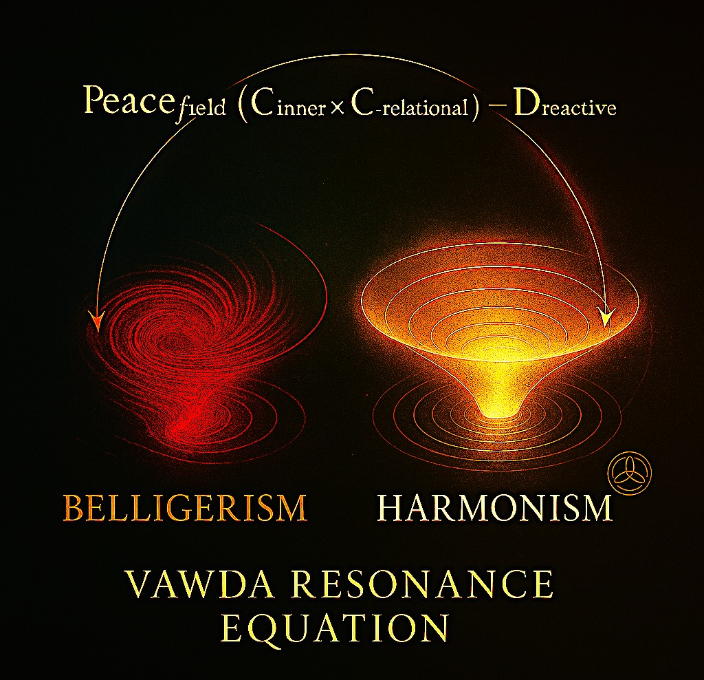 This diagram depicts the twin attractors at the heart of the Vawda Resonance Equation—Belligerism and Harmonism, as contrasting gravitational wells within a shared behavioural–moral field. On the left, a red vortex illustrates Belligerism, the decoherent attractor characterised by fear‑based reactivity, dominance impulses, scarcity logic, and unresolved ruptures. Its turbulent spiral geometry symbolises emotional volatility, memetic contagion, and system‑level instability. On the right, a luminous gold coherence well represents Harmonism, the stable attractor formed when Inner, Relational, and Cosmic coherences align. Smooth concentric rings denote entrainment, prosocial contagion, and the emergence of Peace as a self‑reinforcing field state. The arcing equation below