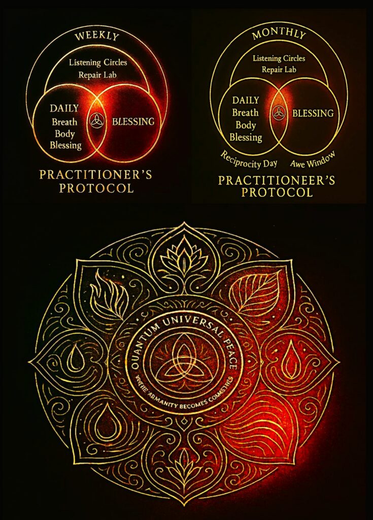 Graphics Top Row: Peace Practitioner’s Protocols: Cadence maps of practice bundles that entrain coherence across scales: Daily (Breath–Body–Blessing), Weekly (Listening Circles; Repair Lab), and Monthly (Reciprocity Day; Awe Window). The golden seal at the centre anchors spiritual intention; bold concentric rings signal reliability over intensity, making coherence a habit rather than an event.