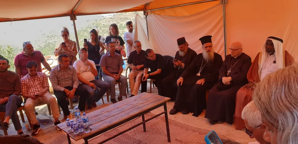 A solidarity gathering of Christian, Jewish and Muslim leaders, both Palestinians and international interfaith activists, in protest of the Zionist State of Israel’s farm land confiscation, Jerusalem, Sept. 2024 (photo by Zarni)