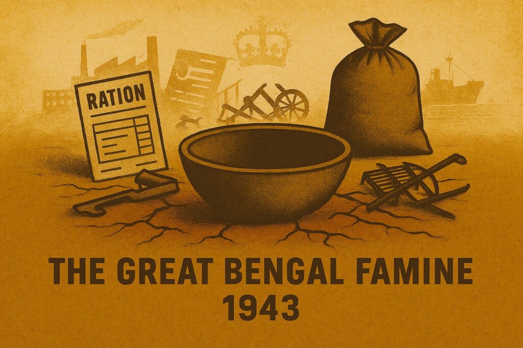 The symbolic graphic represents the Great Bengal Famine of 1943 as a man‑made catastrophe rooted in imperial political economy rather than natural scarcity. The empty grain bowl foregrounds mass hunger produced amid availability, while the sealed grain sack signifies food reserves redirected away from the local population. The ration document evokes bureaucratic governance that privileged administrative order over human survival. Collectively, these elements symbolise three interlocking causes: the export of rice and grain to the United Kingdom to sustain the imperial war effort; the long‑term creation of abject poverty through colonial deindustrialisation, which dismantled Bengal’s agrarian resilience and indigenous production systems; and, most fundamentally, the structural violence of Empire itself, wherein colonial priorities rendered indigenous lives expendable. The cracked earth thus functions not as a marker of drought, but as a metaphor for an economic and moral landscape fractured by imperial extraction, policy neglect, and systemic indifference.”