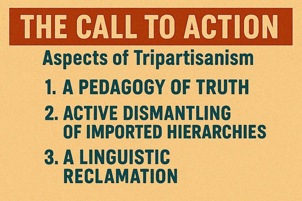 “This graphic articulates a tripartisan framework for institutional and psychosocial transformation, foregrounding a Call to Action grounded in ethical responsibility and critical consciousness. The first arm, A Pedagogy of Truth, underscores the necessity of historically informed, reflexive learning practices that confront epistemic silences and cultivate moral accountability. The second arm, Active Dismantling of Imported Hierarchies, advances a praxis‑oriented commitment to interrogating and restructuring inherited power asymmetries embedded within organisational systems, governance norms, and evaluative cultures. The third arm, A Linguistic Reclamation, affirms language as a site of power and restoration, advocating for the recovery of indigenous epistemologies, reclaimed vocabularies, and contextually rooted narratives. Collectively, these three interdependent dimensions position Tripartisanism as a coherent, actionable model for sustainable human‑centred transformation within contemporary institutions.”