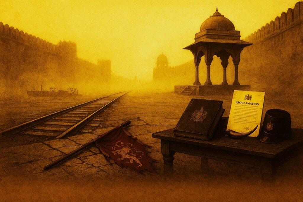 The aftermath‑focused conceptual scene represents the structural consequences of the suppression of the 1857 uprising and the subsequent dissolution of indigenous sovereignty of the Last Mughal Emperor, Shah Zafar Bahadur. The emptied architectural space signifies the erasure of plural governance traditions, while the fallen standard marks the end of symbolic legitimacy without resorting to personal depiction. The intrusion of railway tracks through the former civic and ceremonial space represents the imposition of imperial infrastructure, facilitating extraction, surveillance, and administrative control. The proclamation, ledger, and imperial insignia placed in the foreground denote the transition from relational rule to bureaucratised domination, wherein authority was reconstituted through documents, decrees, and distant accountability. The pervasive dust and haze function as metaphors for exile, silenced memory, and historical amnesia. Collectively, the composition reframes surrender not as an individual act, but as a civilisational rupture, offering a reflective lens on power, governance, and the enduring ethical responsibilities of institutions.