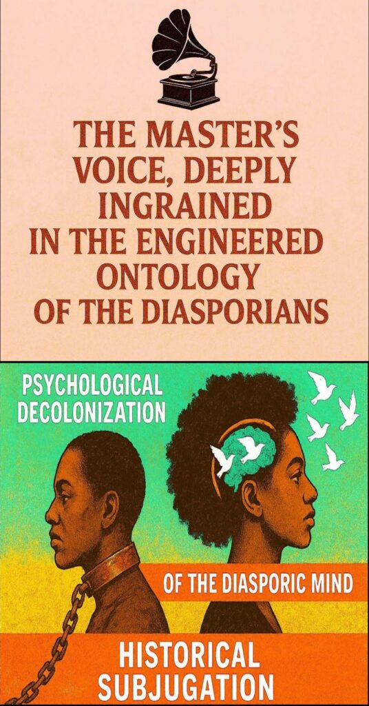 Photo Top: This graphic employs the historical symbol of the gramophone, popularly associated with the phrase “His Master’s Voice”, as a visual metaphor for the enduring internalisation of colonial authority within diasporic consciousness. The absence of human figures foregrounds the operation of systems rather than individuals, emphasising how colonial power persists through repetition, legitimacy, and aesthetic normalisation rather than direct coercion. The typographic weight and classical serif font evoke the epistemic authority of empire, illustrating how colonial discourse was encoded as truth, order, and inevitability. Read conceptually, the image represents a process of ontogenic engineering, whereby the colonised subject comes to absorb and reproduce the coloniser’s worldview as part of their own being. Within the broader framework of decolonial inquiry, the graphic functions as a critical prompt, inviting reflection on the persistence of internalised domination and the necessity of epistemic rupture in the project of decolonising the diasporic mind.