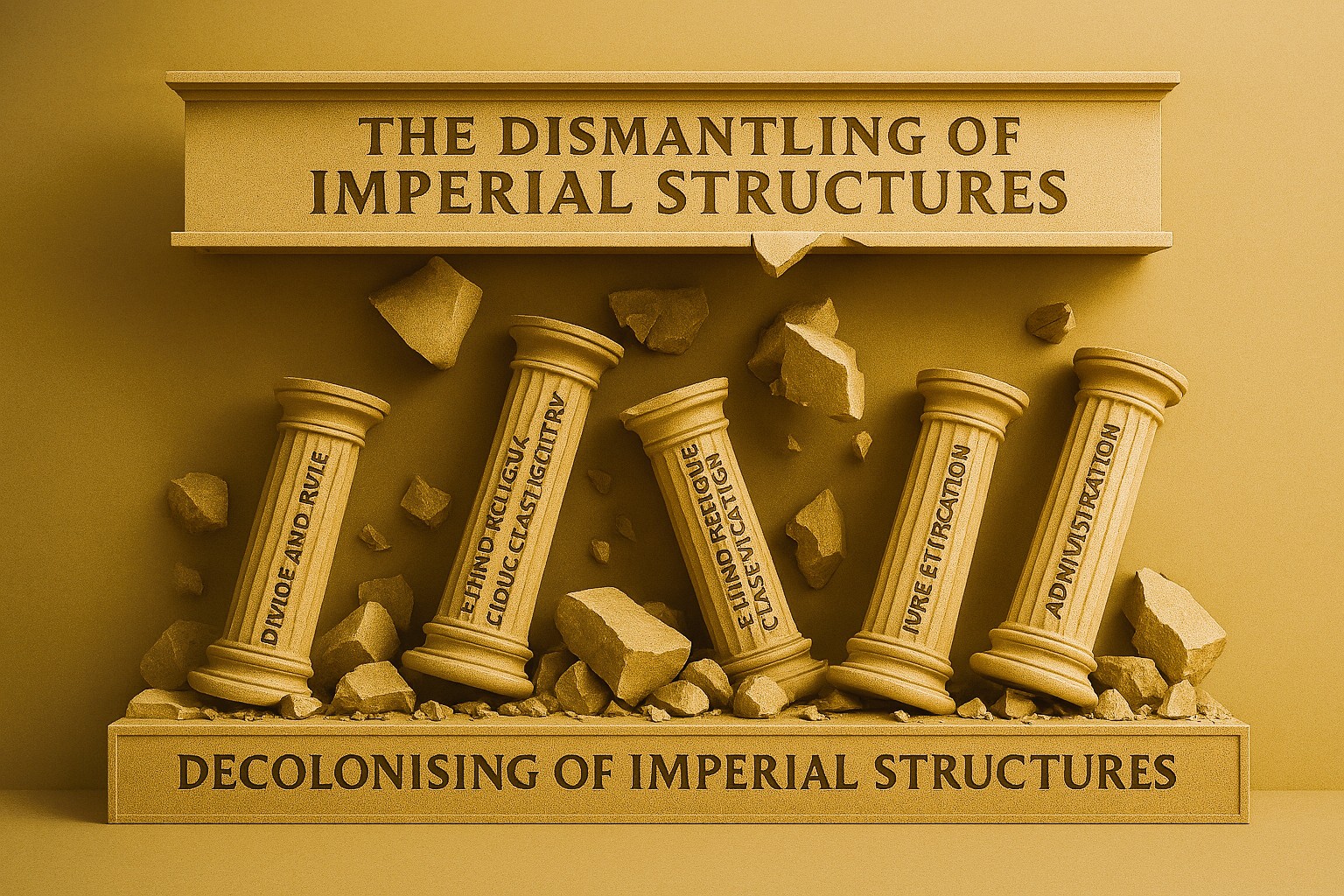 Ethno‑Religious Classification, shown cracked but not fully destroyed, reflects the persistence of identities hardened by colonial census, law, and electoral engineering. The visual tension between collapse and endurance reinforces the argument that decolonisation is uneven, with symbolic freedom often preceding epistemic release.