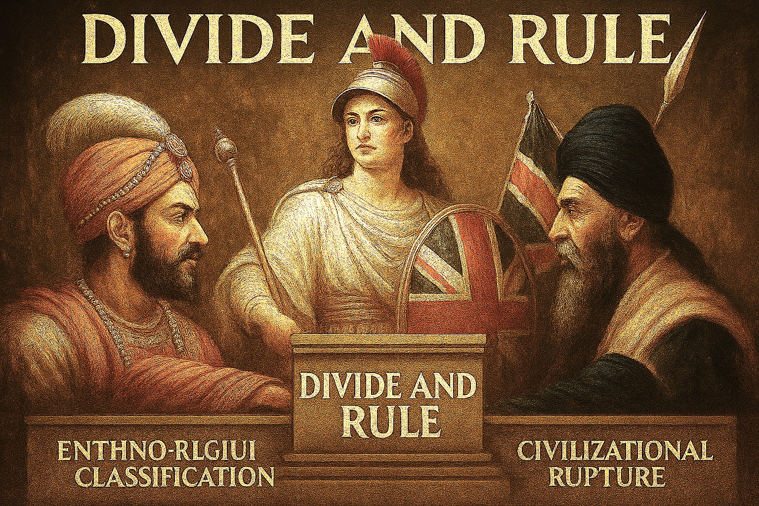The first pillar, Divide‑and‑Rule, represents the strategic fragmentation of Indian society along religious, ethnic, linguistic, and regional lines, deliberately cultivated to inhibit unified political consciousness. This mechanism transformed diversity into vulnerability and internal difference into administrative leverage.